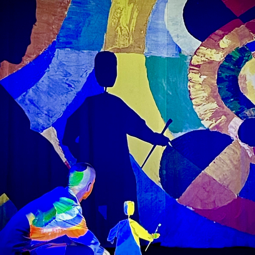SPECTACLE MUSICAL D'IMAGE Ce spectacle est un divertissement théâtral, un voyage poétique où les couleurs prennent vie. Entre musique, théâtre corporel, arts visuels et marionnette, ce geste artistique fait résonner le souffle vital qui traverse chaque couleur. Les créateurs de Daru-Thémpô ont exploré l’histoire et le monde des couleurs à travers les âges, pour imaginer ce spectacle tout en nuances émotionnelles, destiné à tous. On y découvre des œuvres de Robert et Sonia Delaunay, Paul Klee, Kandinsky et autres, qui ont montré que la couleur seule pouvait construire l’espace et transmettre des émotions. Ils pensaient que les couleurs pouvaient bouger et faire rêver, même sans dessiner des choses réelles. « Une méditation sur la lumière et le monde. La couleur est avant tout lumière ; c’est la lumière qui nous permet de percevoir et d’appréhender le monde qui nous entoure. Proposer un spectacle centré sur la couleur revient ainsi à convier le public à une exploration sensible du monde, à travers le prisme de la lumière et de ses variations. Ici, cette invitation prend la forme d’une méditation sur l’essence-même du monde. Les ombres, les couleurs et les jeux de lumière sollicitent nos pupilles et nous entraînent dans un voyage intérieur. La locomotive des Delaunay, les valises posées sur le quai de la scène, la musique lointaine de Butch Mckoy jouée en « live » et les ombres corporelles de Nicolas Charentin, la mise en scène et en images de Nicole Charpentier et Christian Chabaud composent un univers visuel et sonore qui projette le spectateur vers d’autres images et de nouvelles destinations en devenir. À l’issue de ce voyage, on ressort apaisé — sentiment particulièrement précieux en ces temps troublés. » Vincent Lalanne, Écrivain. Ex-directeur de l’Agence Culturelle Départementale de l’Essonne.